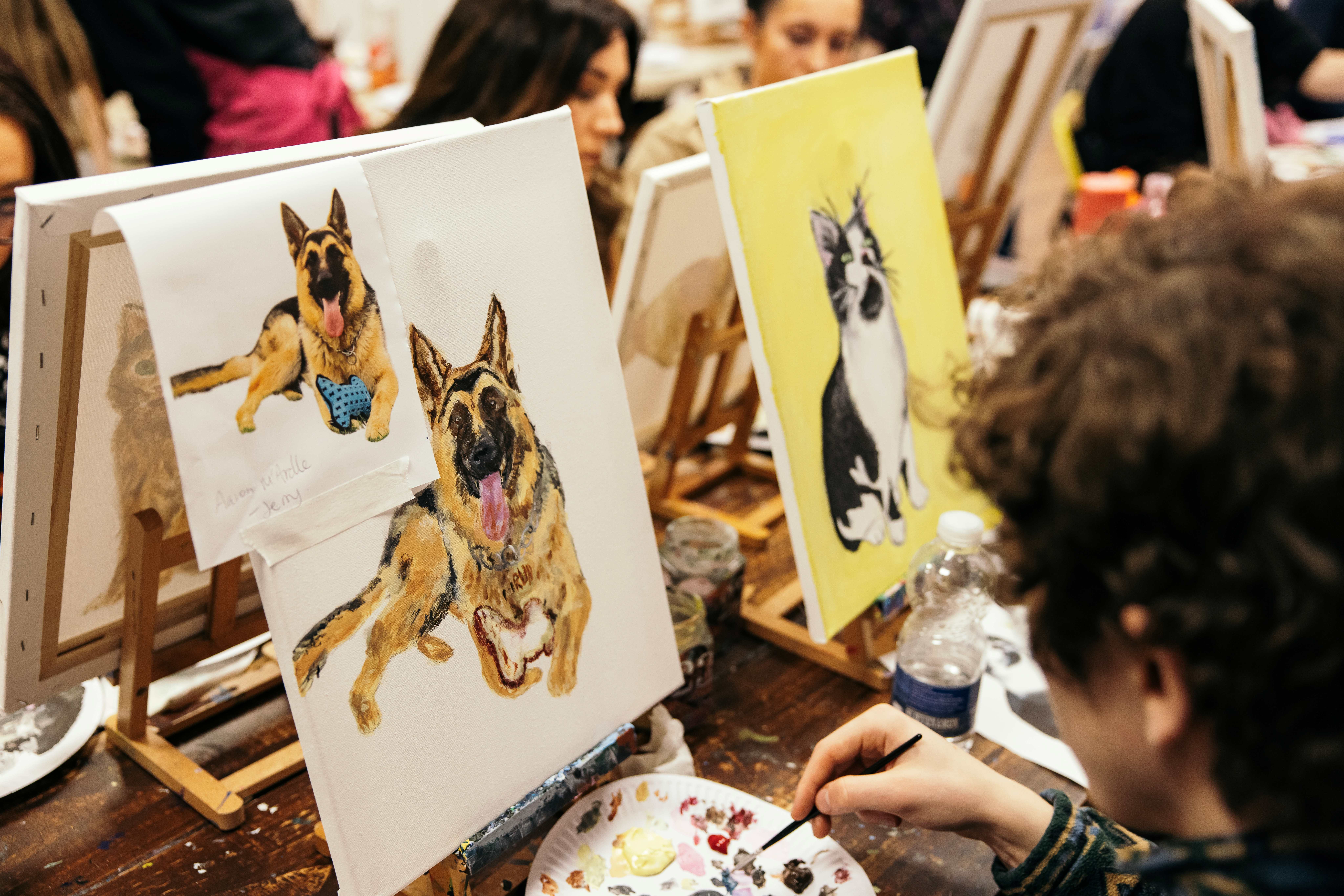 We supply materials. For “Paint Your Pet,” we’ll email you about sending a clear photo after booking.